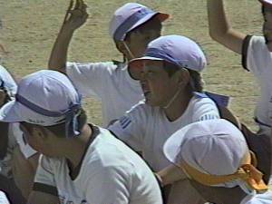 下の写真は、ゴールした生徒を着順の場所へ誘導する「ゴール係り」をしているところです。