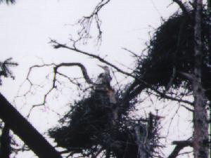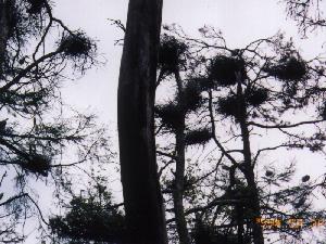 ↓左の写真の中央に青鷺が写っています。右の写真の枝が丸くかたまっているのが全部青鷺の巣です。