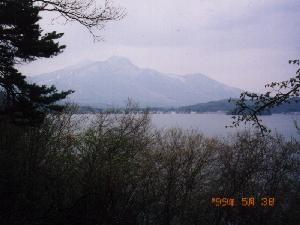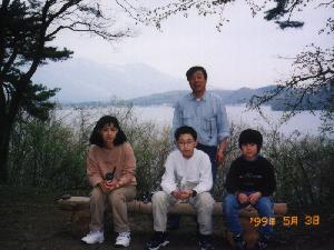 ↓左の写真は野尻湖と対岸の妙高山、右の写真は我が家の裕子さんと悟、そして後ろで立っているのがIさんで右端がヒロくん。