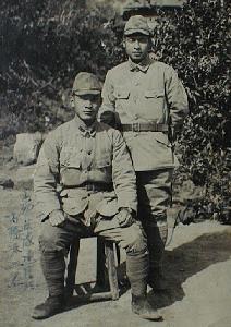 右側で立っている方が父で、当時は上等兵だったそうですが、人材不足で小隊長をしていたそうです。(^_^;)